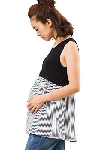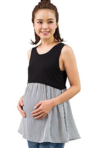 Sweet Mommy お肌に優しい なめらか竹繊維 ジョーゼット 裾フリル 柔らか ストレッチ素材 ストライプ タンクトップ 産前産後 授乳服 マタニティ/L/ブラック×ストライプ