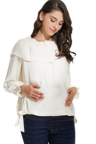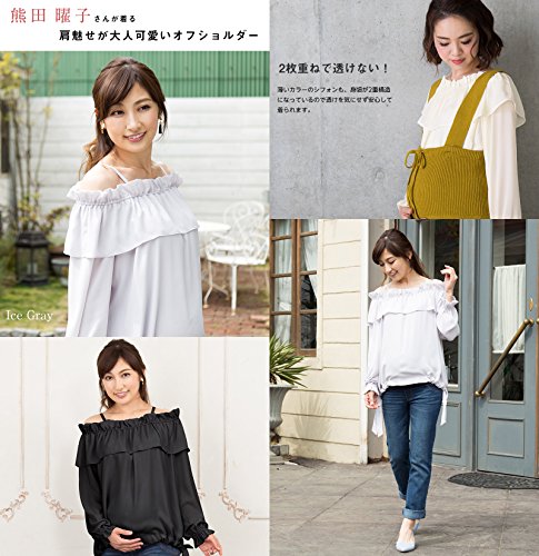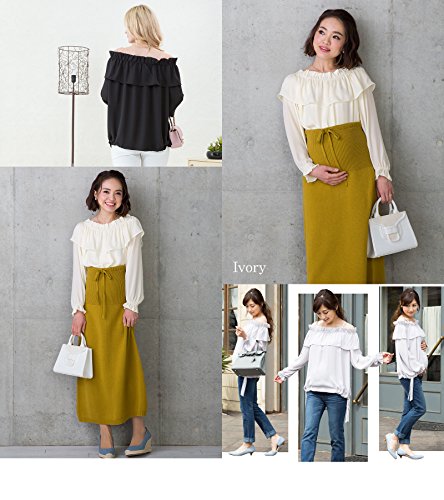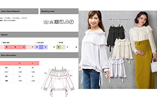 Sweet Mommy マタニティトップス 授乳服 フリルブラウス オフショルダーにもなる 3WAYトップス 軽やかシフォン 透けない2枚重ね 裾リボン調節 ストラップ取り外し可能 授乳口付き オフィス 大きいサイズ 長袖 産前産後/アイボリー/L