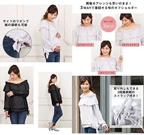 - 【3WAYで産前産後着回せる!】肩魅せがおしゃれな旬のSweet Mommy 3WAY フリル オフショルダー ブラウス 軽やかシフォン 透けない2枚重ね 裾リボン調節 ストラップ取り外し可能 プルオーバー 産前産後 授乳服 マタニティ