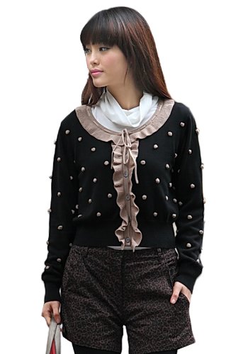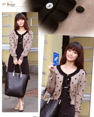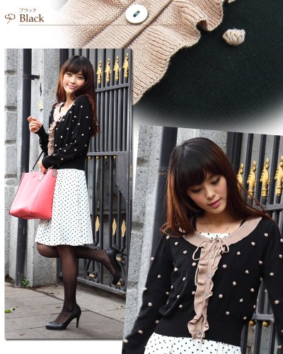 スウィートマミー オーガニックコットン100% 配色 ニット ボールドット カーディガン L ブラック×ベージュ