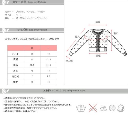 - サイズ(cm):M(バスト90,肩幅37,裾幅31.5,着丈48,袖口幅7,袖丈59), L(94,38.5,33.5,50,7.5,60)