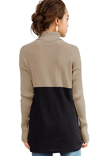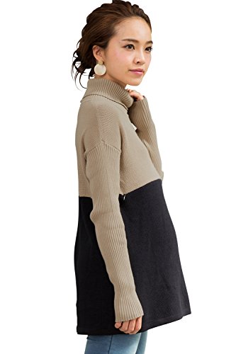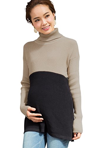 Sweet Mommy バイカラー オーガニックコットン ふっくら片畦編み ロング丈 リブ袖 Aライン タートルニット セーター 授乳服 マタニティ/M/ベージュ×ブラック