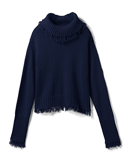 太めのリブ編みでボリュームのあるタートル襟にもフリンジをあしらって、1枚でも存在感抜群の主役ニットです。