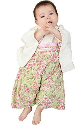 Sweet Mommy 【女の子】ベビー袴 無染色オーガニックコットン×ちりめん和柄 足元2WAY 和服 日本製素材 コットン裏地 ベビー服 赤ちゃん 0~3歳 ロンパース ワンピースタイプ ギフトにも 七五三 お食い初め 初節句 お宮参り お正月 和装 ギフト お祝い/グリーン/90