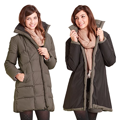 Sweet Mommy 抱っこ・おんぶ対応 ママコート リバーシブル マタニティ ウエストリボン 上質ダウン90% 撥水加工 ダッカー付き 軽量 あったか バイカラー ダウンコート 産前産後兼用/カーキ×ブラック/L