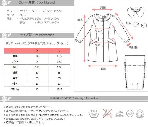 - サイズ(cm): M(肩幅36,バスト98,腹囲118,裾幅63,着丈83,袖丈55,袖口幅12), L(37.5,102,122,65,85,57,12.5)