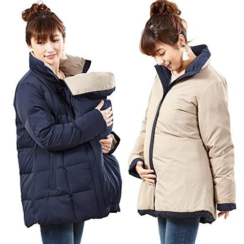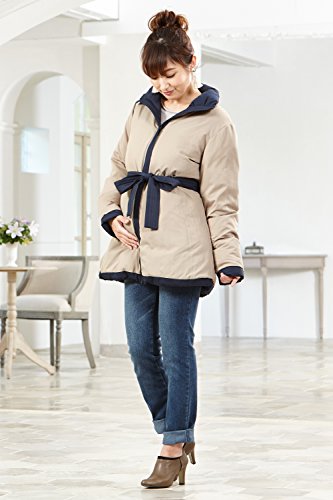 Sweet Mommy 抱っこ・おんぶ対応 ママコート リバーシブル マタニティ ウエストリボン 上質ダウン90% 撥水加工 ダッカー付き 軽量 あったか バイカラー ダウンコート 産前産後兼用/ネイビー×グレージュ/S