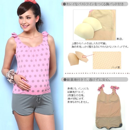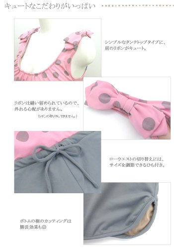 キュートなピンク基調のドット柄に、ボトムタイプのスポーティーなシルエット!肩の大きめリボンが可愛らしさを添えます。