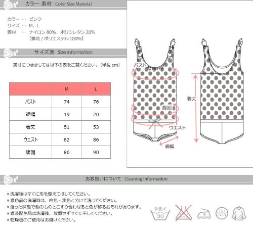 - サイズ(cm):M(バスト74,裾幅19,着丈〈背中心〉51,ウエスト82,腹囲86)L(76,20,53,86,90)