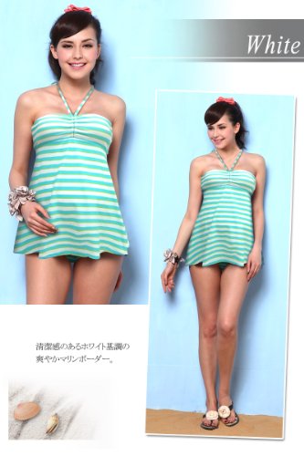 エメラルドのマリンボーダーが涼しげで爽やかなスタイルのスイムウェア。