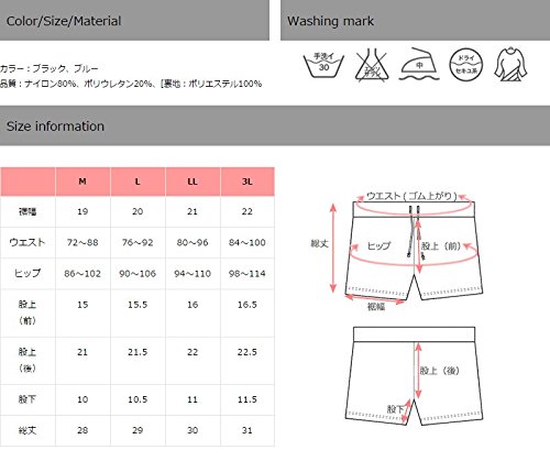 - サイズ(cm):M[裾幅19,ウエスト(ゴム上り)72-88,ヒップ86,股上(前)15,股上(後)21,股下10,総丈28],L[20,76-92,90,15.5,21.5,10.5,29],LL[21,80-96,94,16,22,11,30]
