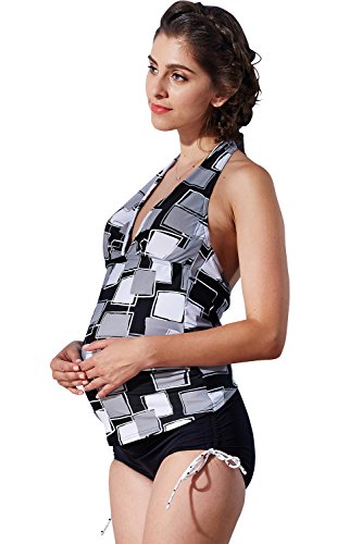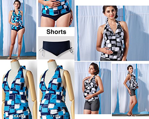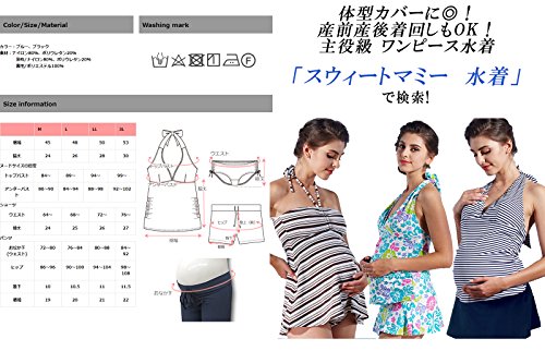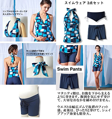 Sweet Mommy マタニティ 水着 3点セット ソフトパッド付 スクエアプリント タンキニ デニム風ショートパンツ ホルターネック スイムウェア 大きいサイズ 夏 産前産後/3L/ブラック