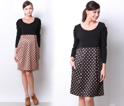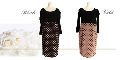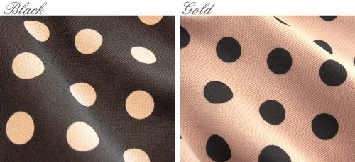 ブラックとゴールドの配色が印象的なドット柄が、子どもっぽくならず、大人可愛いフェミニンなワンピース。