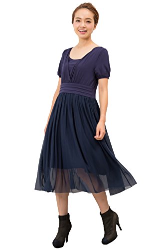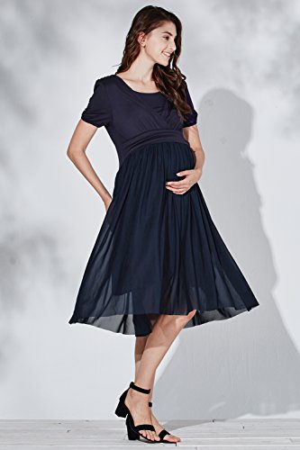 Sweet Mommy マタニティワンピース 授乳服 授乳口付き 透けチュール×ストレッチレーヨン マキシワンピ 授乳レイヤー取り外し可能 裏地付き ミモレ丈 半袖 大人可愛い ママワンピース 春 夏 産前産後 L ネイビー