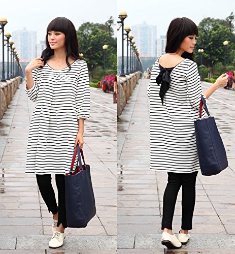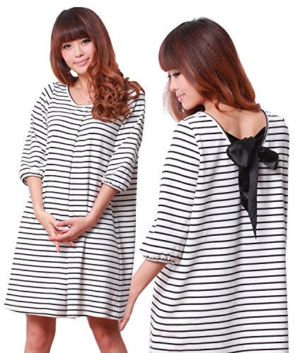 Sweet Mommy バックサテンリボン コットンポンチ素材 大人カジュアル ベーシックボーダー 異素材MIX 授乳チュニック ワンピ授乳服 マタニティウェア 産前産後 / ホワイト / F