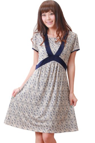 スタイル美人 アクセントトリミング授乳ワンピース【ネコ柄】/M/ベージュ