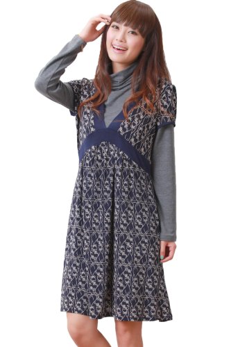 スタイル美人 アクセントトリミング授乳ワンピース【ネコ柄】/M/ネイビー