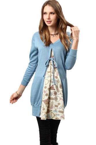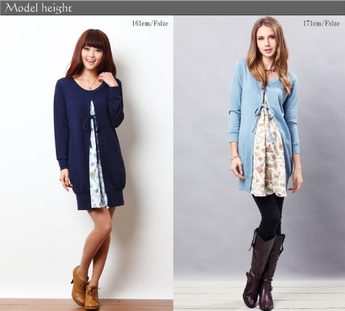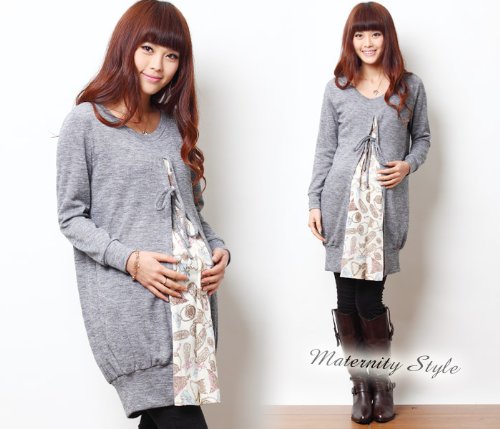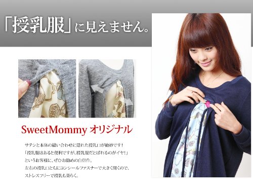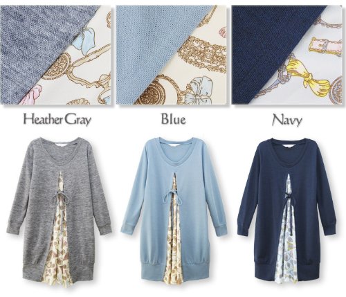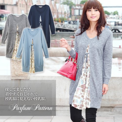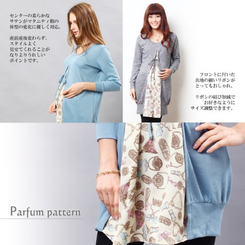 重ね着風 パフューム柄サテン&ニット コンビ 授乳チュニック 授乳服 / マタニティウェア/F/ブルー