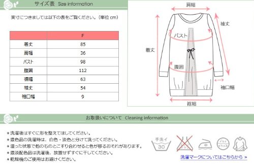 - サイズ(cm):F(着丈85,バスト98,腹囲112、肩幅36、袖丈54、袖口幅9)