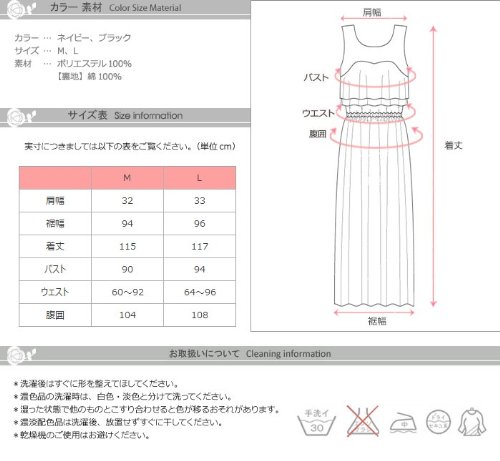 - サイズ(cm):M(肩幅32,裾幅94,着丈115,バスト90,ウエスト60-92,腹囲104)、L(33,96,117,94,64-96,108)