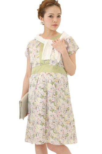 スウィートマミー (Sweet Mommy) フラワープリント サテン 授乳ワンピース マタニティ / 授乳服 M ライム