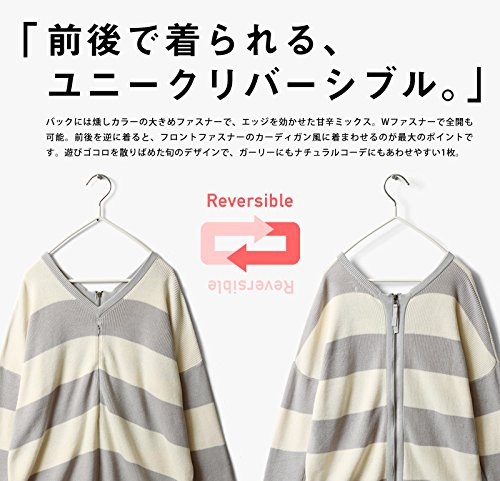 - 前後2WAY仕様:バックにはエッジの効いた燻しカラーの大きめWファスナー付き。前後を逆にするとカーディガン風に着回せます。