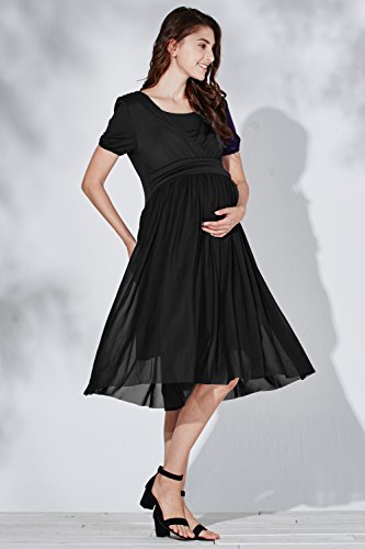 Sweet Mommy 透けチュール×ストレッチレーヨン マキシワンピ 授乳口付き 授乳レイヤー取り外し可能 裏地付き ミモレ丈 半袖 大人可愛い ママワンピース 春 夏 産前産後 授乳服 マタニティウェア M ブラック