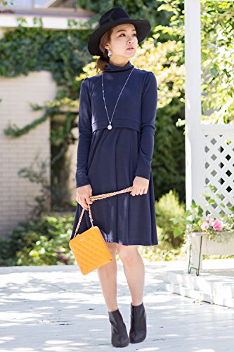 Sweet Mommy コットン裏起毛 ハイネック フレア ママワンピ ストレッチフィット 着痩せ 授乳ワンピ 秋冬 産前産後 授乳服 マタニティ L ネイビー