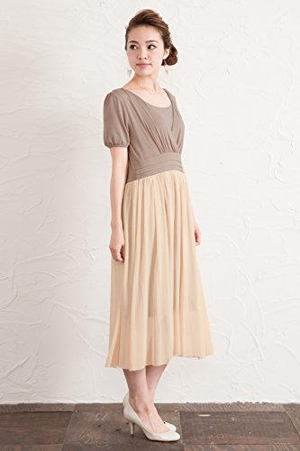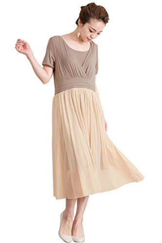 Sweet Mommy マタニティワンピース 授乳服 授乳口付き 透けチュール×ストレッチレーヨン マキシワンピ 授乳レイヤー取り外し可能 裏地付き ミモレ丈 半袖 大人可愛い ママワンピース 春 夏 産前産後 M モカ×ベージュ