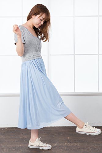 Sweet Mommy マタニティワンピース 授乳服 授乳口付き 透けチュール×ストレッチレーヨン マキシワンピ 授乳レイヤー取り外し可能 裏地付き ミモレ丈 半袖 大人可愛い ママワンピース 春 夏 産前産後 L 杢グレー×サックス