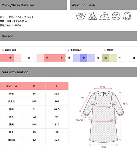 - サイズ(cm): M(肩幅34,バスト100,裾幅61,着丈92,腹囲106,袖丈49,袖口幅12), L(35.5,104,62.5,94,110,50,12.5)