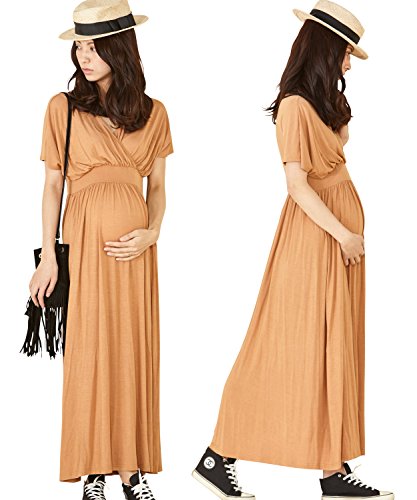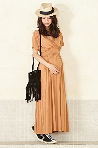 Sweet Mommy ワイドショルダー とろみリラックスワンピ マキシ丈 授乳機能付き ハイウエスト ママのための短めマキシ 大人可愛い ワンピース リゾート 春 夏 産前産後 授乳服 マタニティ L キャメル