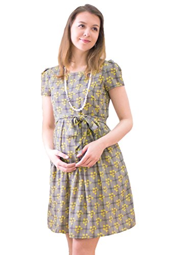 Sweet Mommy ドレープデシン素材 千鳥格子 総柄 オーガニックコットン裏地付き ウエストリボン取り外し可能 授乳ワンピ 上品 ママドレス オフィス 産前産後 授乳服 マタニティ M グレー