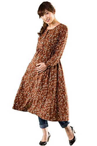 Sweet Mommy ヴィンテージフラワープリント マママキシ コーディガン ブラウジングリボン ママワンピ 2WAY レトロマキシ 授乳レイヤー付き ポケットあり スナップボタン 産前産後 着回し 実用新案取得レイヤー マタニティ 授乳服/M/ブラウン