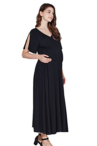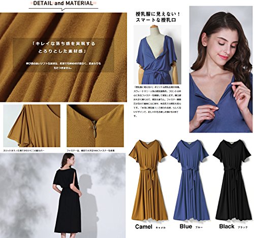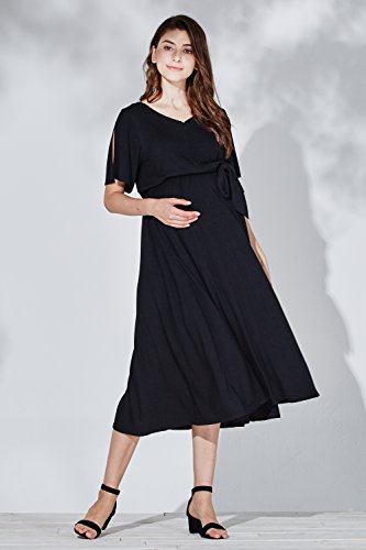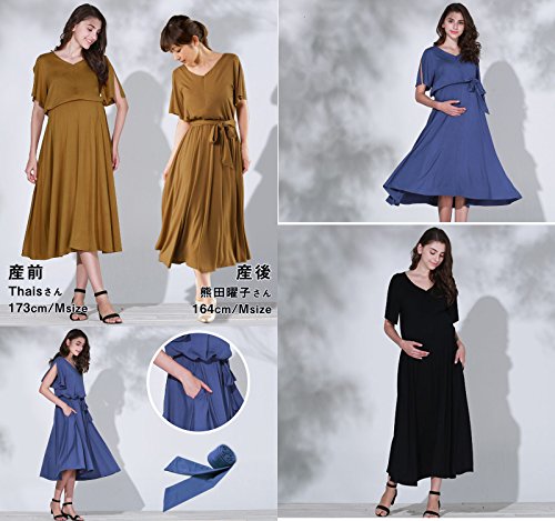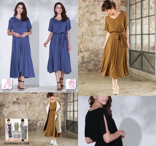 Sweet Mommy Vネック とろみシルエットワンピ スリットスリーブ プチマキシ ブラウジング ウエストゴム調節 リボン取り外し可 ポケット付き 春 夏 ママワンピ 授乳服 マタニティ 産前産後/L/ブラック