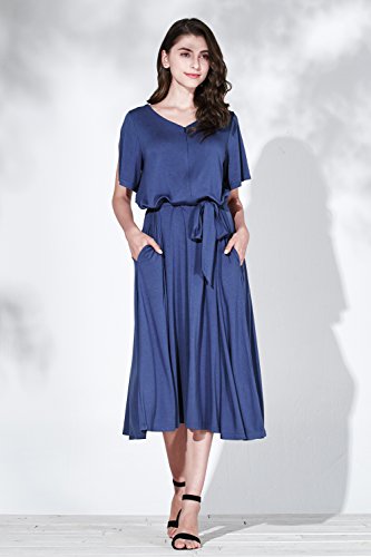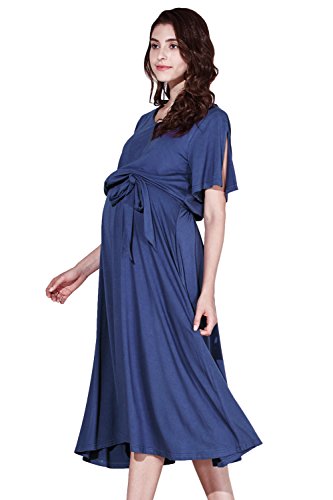 Sweet Mommy Vネック とろみシルエットワンピ スリットスリーブ プチマキシ ブラウジング ウエストゴム調節 リボン取り外し可 ポケット付き 春 夏 ママワンピ 授乳服 マタニティ 産前産後/L/ブルー