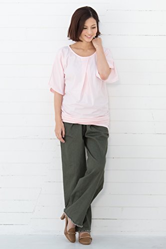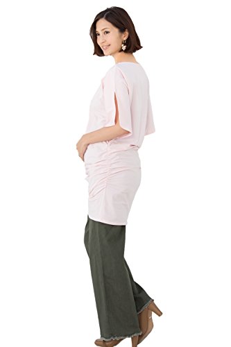 Sweet Mommy スリットスリーブ スリムフィットギャザーワンピ ストレッチコットン ロングT シンプル ママワンピース チュニック 授乳口付き 産前産後 授乳服 マタニティ/ピンクベージュ/M