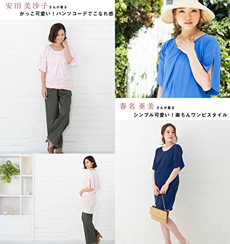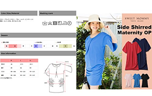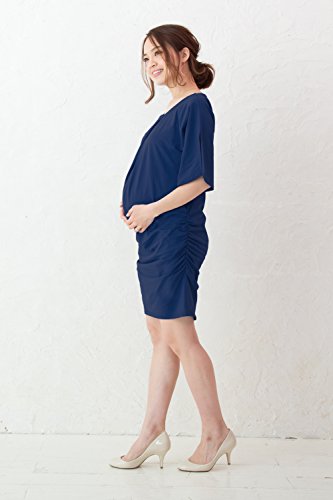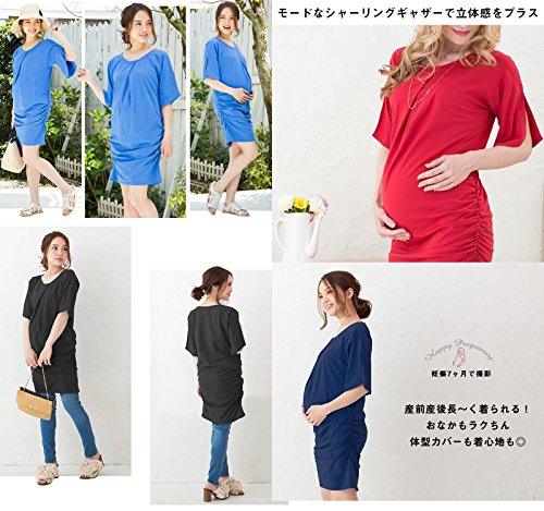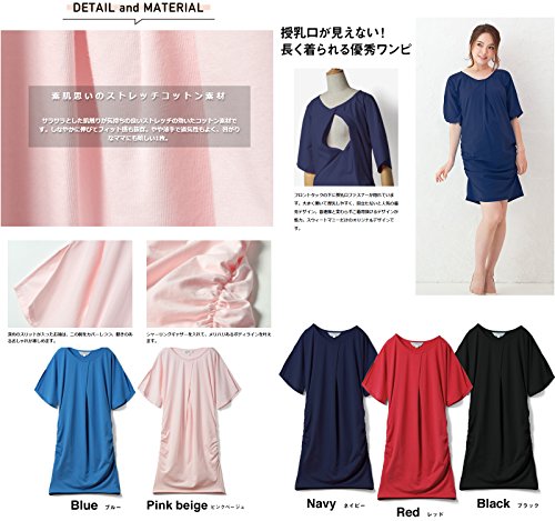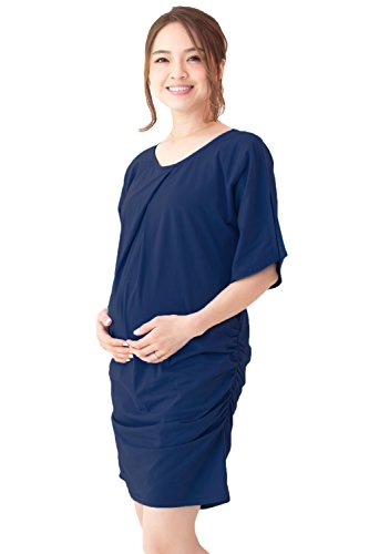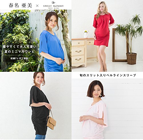 Sweet Mommy スリットスリーブ スリムフィットギャザーワンピ ストレッチコットン ロングT シンプル ママワンピース チュニック 授乳口付き 産前産後 授乳服 マタニティ/ネイビー/M