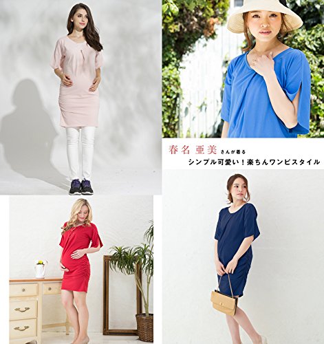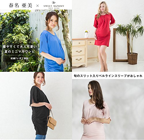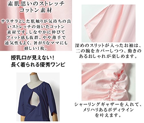 Sweet Mommy マタニティ 授乳服 ワンピース スリットスリーブ スリムフィットギャザーワンピ ストレッチコットン ロングT 授乳口付き 大きいサイズ 春 夏 産前産後/ブルー/M