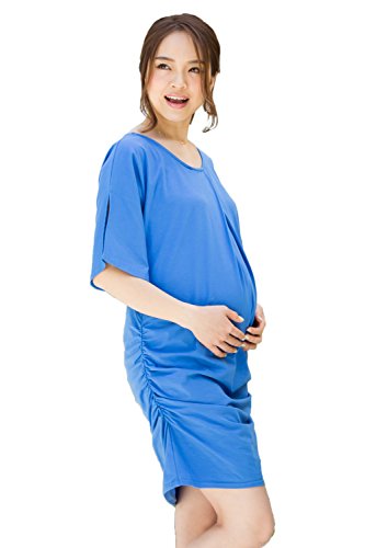 Sweet Mommy スリットスリーブ スリムフィットギャザーワンピ ストレッチコットン ロングT シンプル ママワンピース チュニック 授乳口付き 産前産後 授乳服 マタニティ/ブルー/L