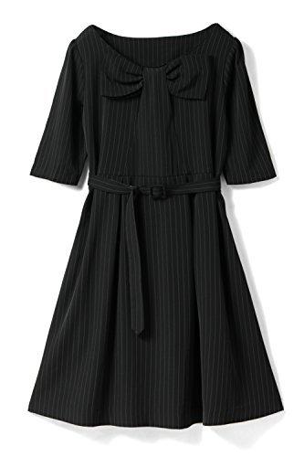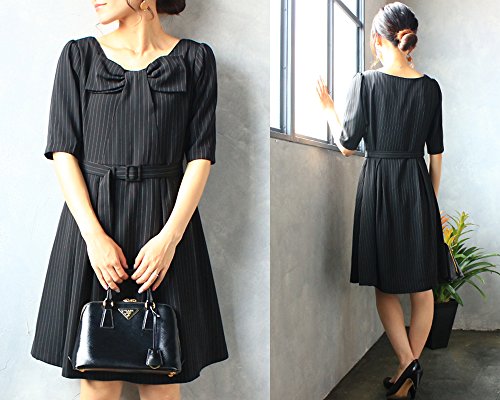 Sweet Mommy 大人可愛い ピンストライプ リボンワンピ 授乳口付き 裏地付き 大きいサイズ ストレッチツイル素材 ポケット付き 共地ベルト付き 上品 オフィス ワンピース 5分袖 着痩せ 春 夏 秋 産前産後 授乳服 マタニティ/ブラック/LL