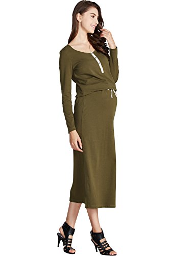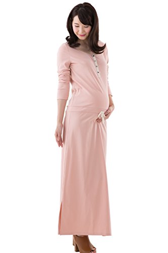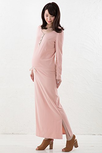 Sweet Mommy マタニティ 授乳服 ワンピース マキシ ウエストブラウジング 長袖 スナップボタンで授乳簡単 透けない スリット 大きいサイズ カジュアル 春 秋 冬 産前産後 M/ピンク