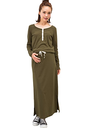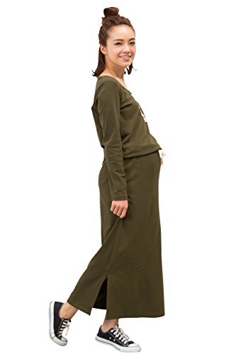 Sweet Mommy マタニティ 授乳服 ワンピース マキシ ウエストブラウジング 長袖 スナップボタンで授乳簡単 透けない スリット 大きいサイズ カジュアル 春 秋 冬 産前産後 LL/カーキ