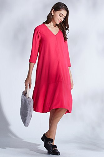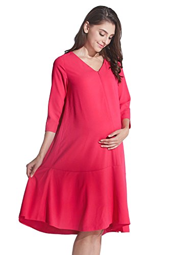 Sweet Mommy マタニティ 授乳服 ワンピース Vネック 裾フレア 授乳口 大きいサイズ 小さいサイズ 裏地付き ママワンピ ドレス 長袖 7分袖 シンプル Aライン お呼ばれ ベビーシャワー 二次会 パーティー 春 夏 秋 産前産後/ホットピンク/M