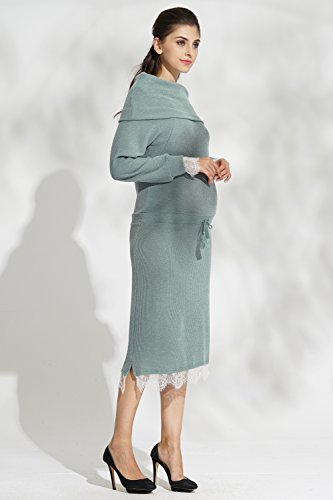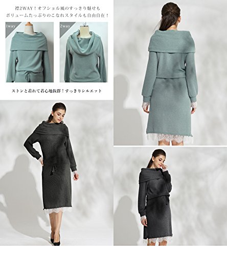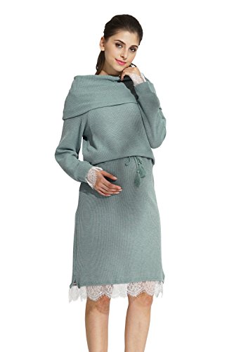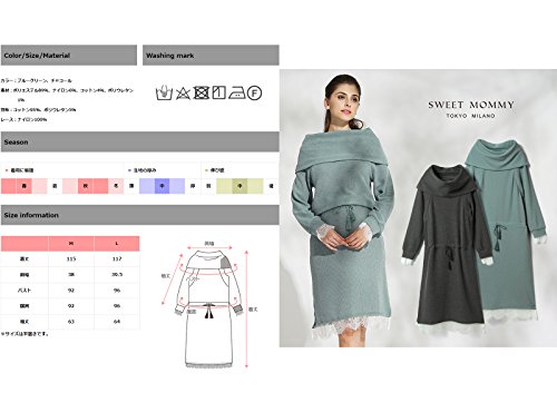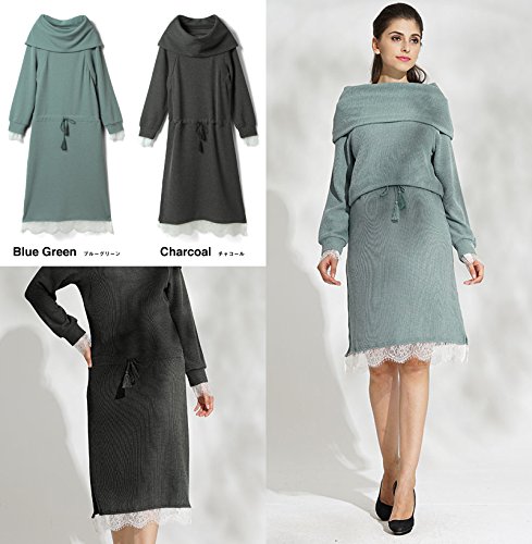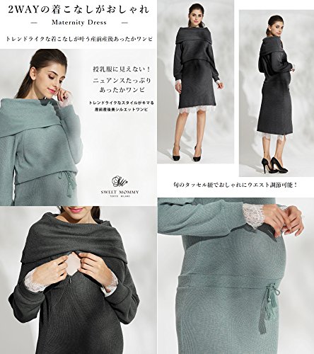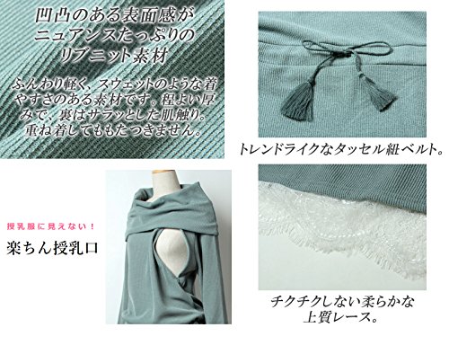 Sweet Mommy マタニティ 授乳服 ワンピース レースコンビ ミラノリブ タッセル紐 ウエスト調節 オフタートル オフショルダー 襟2WAY 授乳口付き 大きいサイズ 春 秋 冬 産前産後/ブルーグリーン/L
