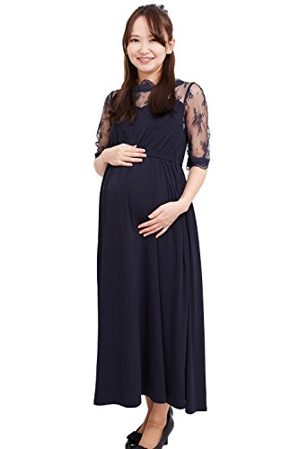 Sweet Mommy マタニティ 授乳服 ワンピース 授乳口付き レース切り替え 5分丈・M ネイビー