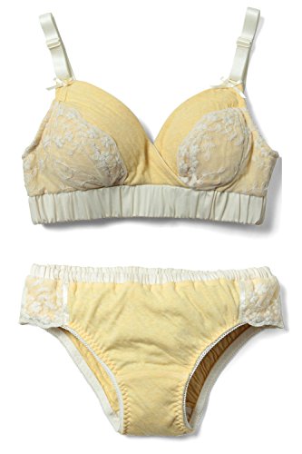 Sweet Mommy 【日本製】 ふわかる授乳ブラ&産後用ショーツセット オーガニックコットン100% 4段階アジャスター コットン刺繍 チュールレース エアリーブラ ノンワイヤーブラジャー 取り外し可能パッド付き/イエロー/M