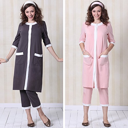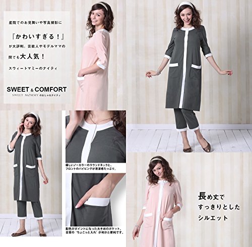 Sweet Mommy バイカラーパイピング ナイティ 上下パジャマ 授乳レイヤー 3点セット やわらかコットン ウエスト調節機能 赤ちゃんにボタンがあたらない ワンピース風 7分袖 前開き フロントポケット 入院準備 産前産後 授乳服 L チャコール