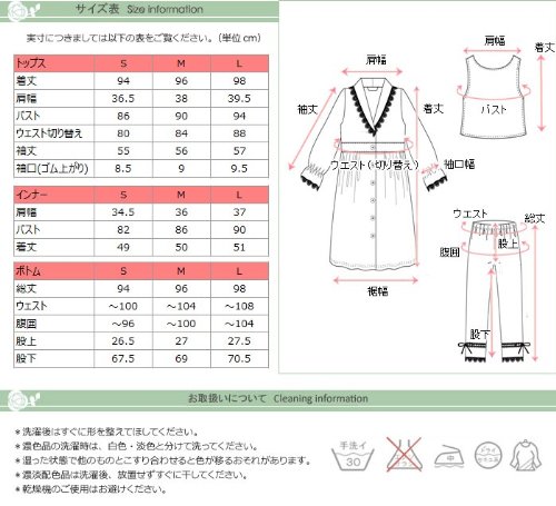 - サイズ(cm):トップス[着丈S94/M96/L98, 肩幅36.5/38/39.5, バスト86/90/94, ウエスト切替80/84/88, 袖丈55/56/57, 袖口8.5/9/9.5] インナー[肩幅34.5/36/37, バスト82/86/90, 着丈49/50/51] ボトム[総丈94/96/98, ウエスト~100/~104/~108,腹囲~96/~100/~104, 股上26.5/27/27.5, 股下67.5/69/70.5]