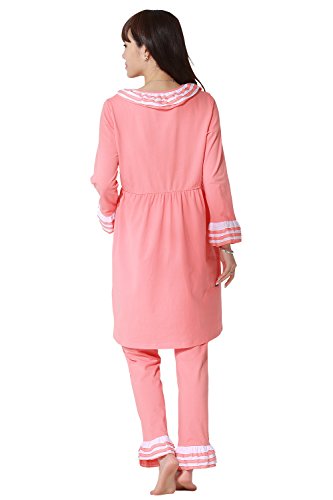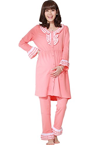 Sweet Mommy ツートーンフリルナイティ 軽やかコットンパジャマ上下 授乳レイヤー 3点セット ウエスト調節アジャスター付き ワンピースガウン風 お花ボタン 実用新案登録済みインナー 入院 授乳口付き 上品 産前産後 授乳服 マタニティ/ピンク/M
